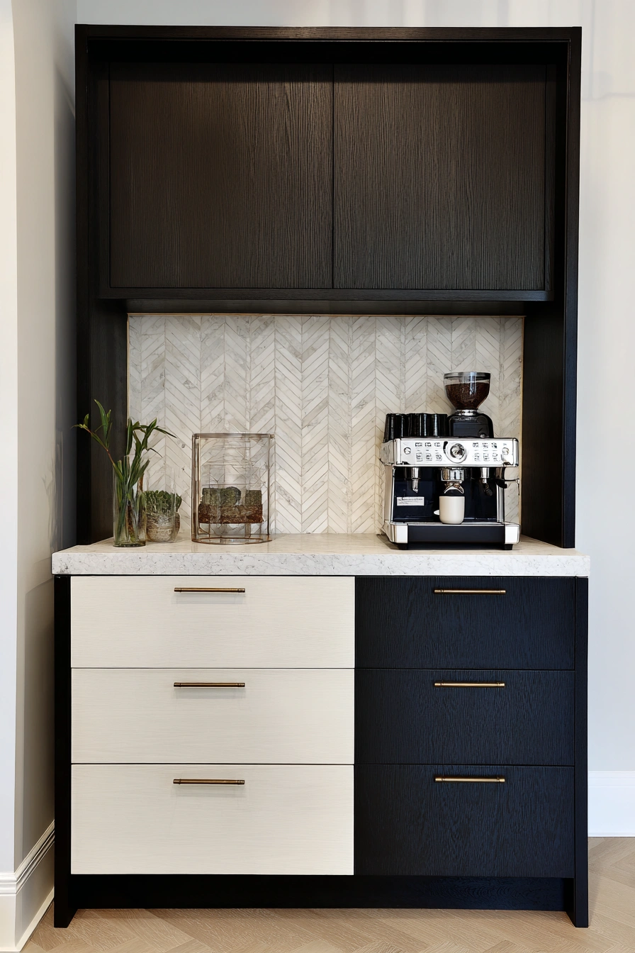 The powerful contrast of black and white cabinetry creates a timeless elegance, which is enhanced by subtle textures that invite you to touch and explore. To achieve a sophisticated yet warm atmosphere in your kitchen, incorporate metallic hardware and natural accents. For a cohesive look, consider a herringbone tile backsplash in soft gray tones and a light marble countertop to complement the cabinetry. Pair this with light oak flooring to add warmth and balance to the modern aesthetic.
