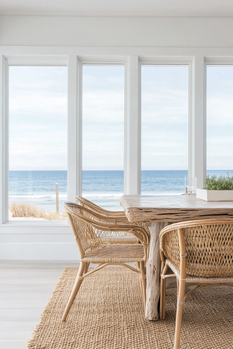 A light-filled dining space with natural woven chairs, a pale oak dining table, and floor-to-ceiling windows that offer breathtaking ocean views. The color palette consists of whites, beiges, and soft sea blues, creating a relaxed, sunlit ambiance. You can recreate this look with light wood tones, breezy textiles, and subtle coastal accents.