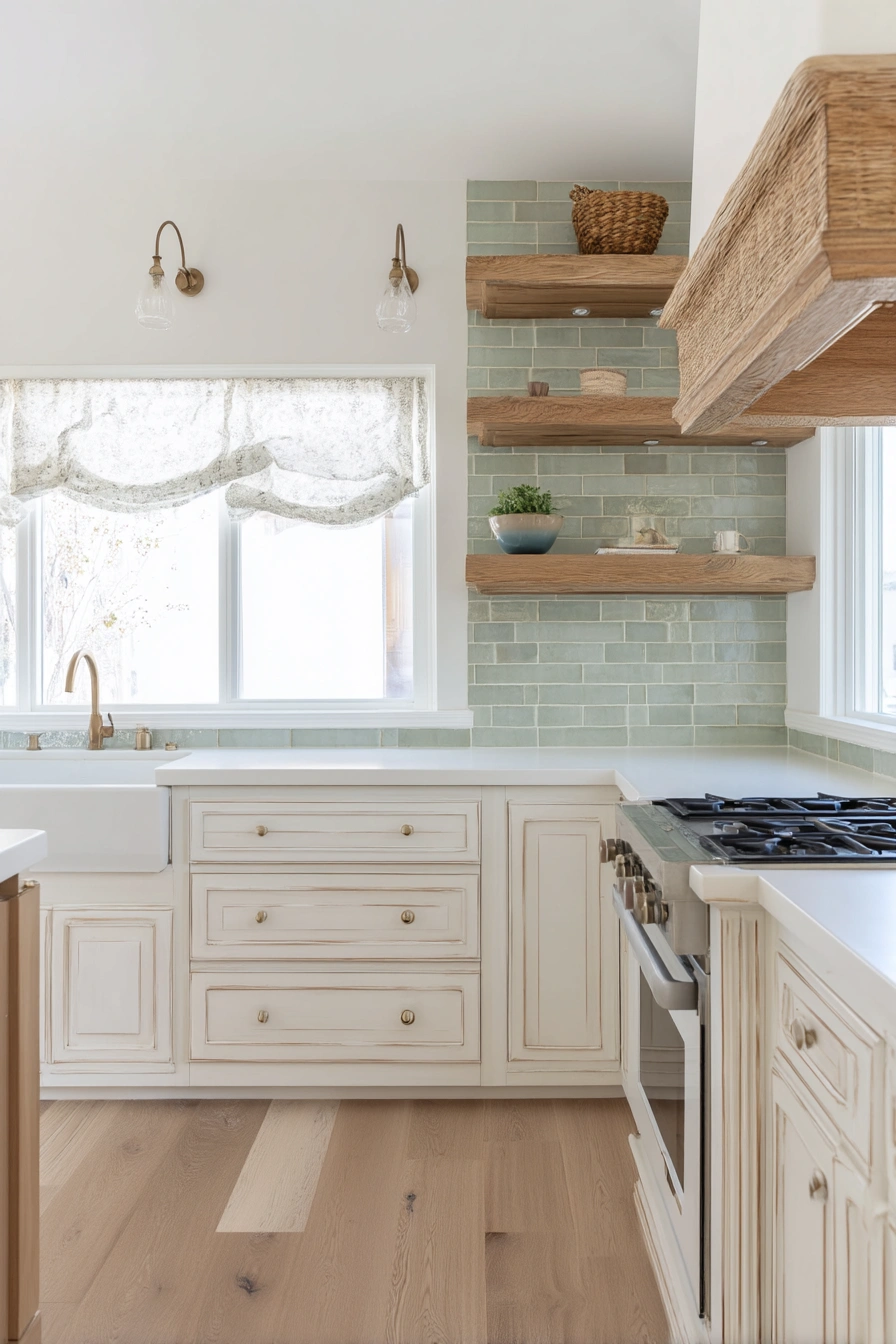 The elegant antique white cabinetry paired with rustic wooden shelves creates a warm, inviting atmosphere, while the soft green tiles add a refreshing touch. To achieve a balance of sophistication and comfort in your own kitchen, incorporate natural textures and gold accents.
