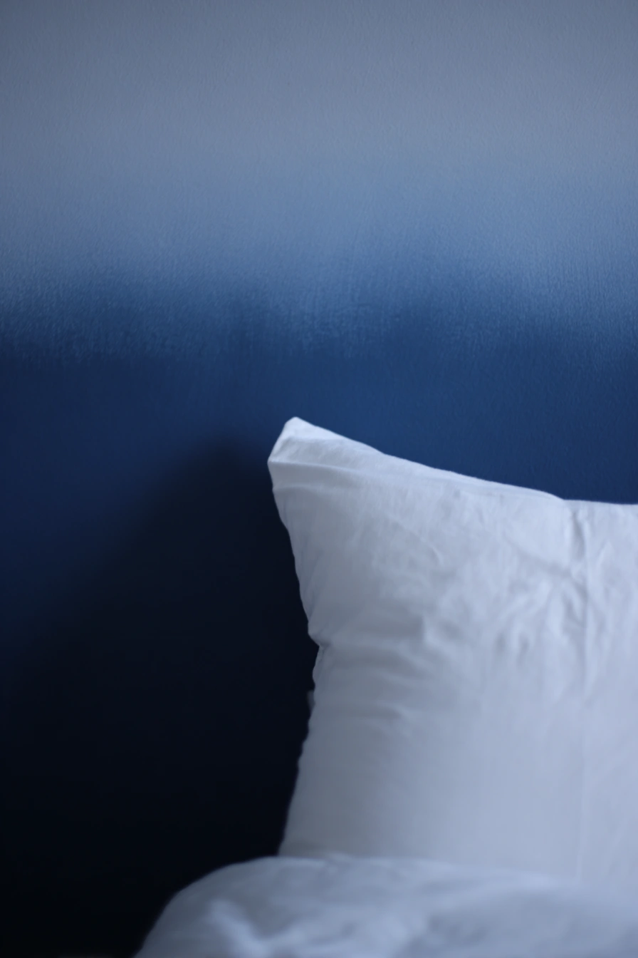 I love how the ombre effect moves from a deep navy to a mere whisper of sky blue, as if the wall took a peaceful moment to breathe. The speckled fade in the middle reads as handmade and relaxed, so it feels intentional without trying too hard. It’s perfect as a headboard moment that doesn’t require any extra fuss, and it makes small bedrooms feel curated and calm.