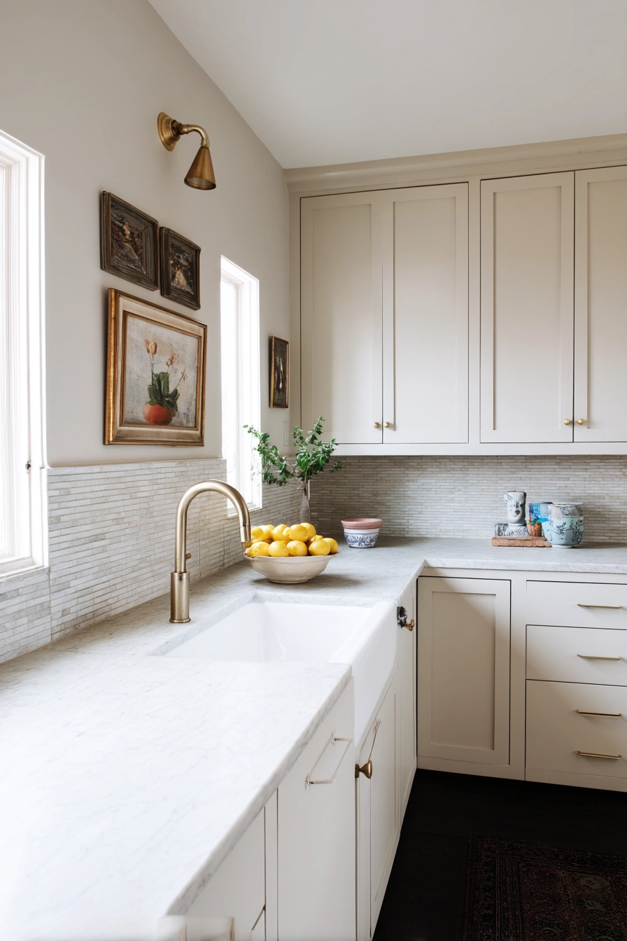 The soft cream cabinetry paired with elegant brass accents creates a timeless warmth in this kitchen, while the marble countertops bring a touch of sophistication. To replicate this look, incorporate vintage-inspired accessories and natural textures to ensure a harmonious blend of functionality and style.