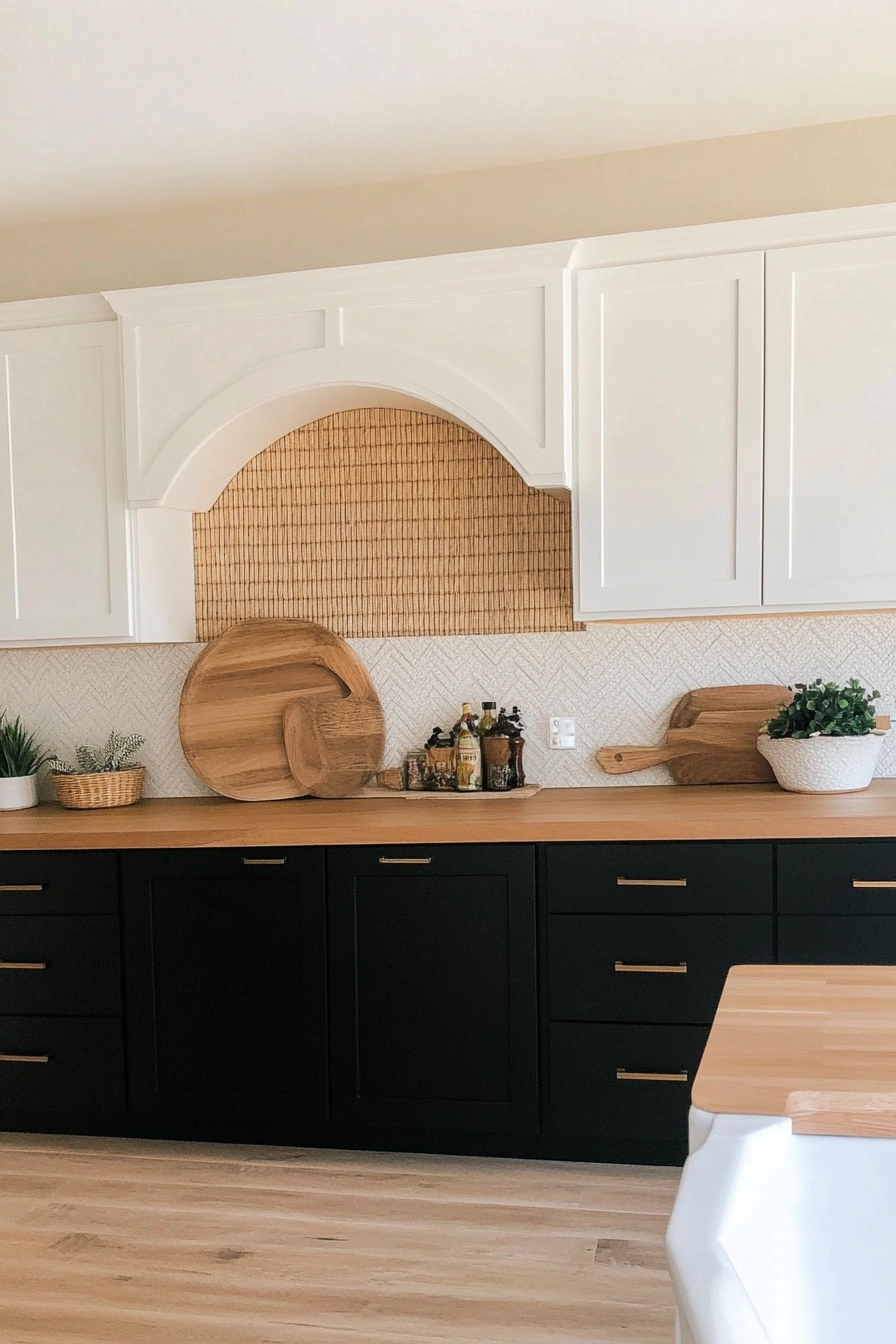 The striking contrast of matte black cabinetry with warm wood accents creates a sophisticated yet inviting atmosphere, elevated by textured backsplash tiles. To get this look, incorporate natural materials and greenery for added warmth, while keeping your accessories minimal for a clean, modern aesthetic.