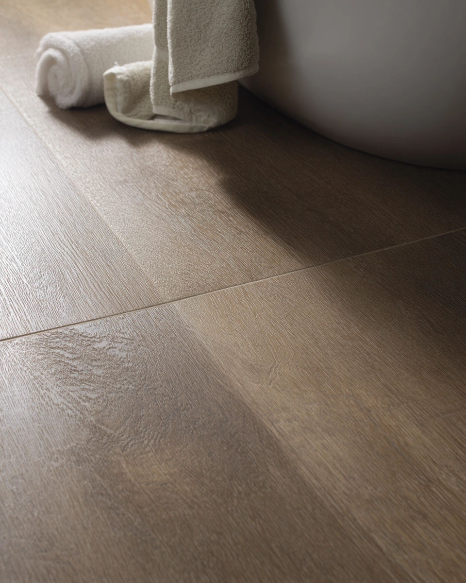 This warm brown textured flooring instantly makes a bathroom feel cozy and welcoming. It pairs beautifully with soft, neutral towels and a sleek, modern tub. To get this look, stick with similar earthy tones and textures to create a harmonious and relaxing atmosphere.