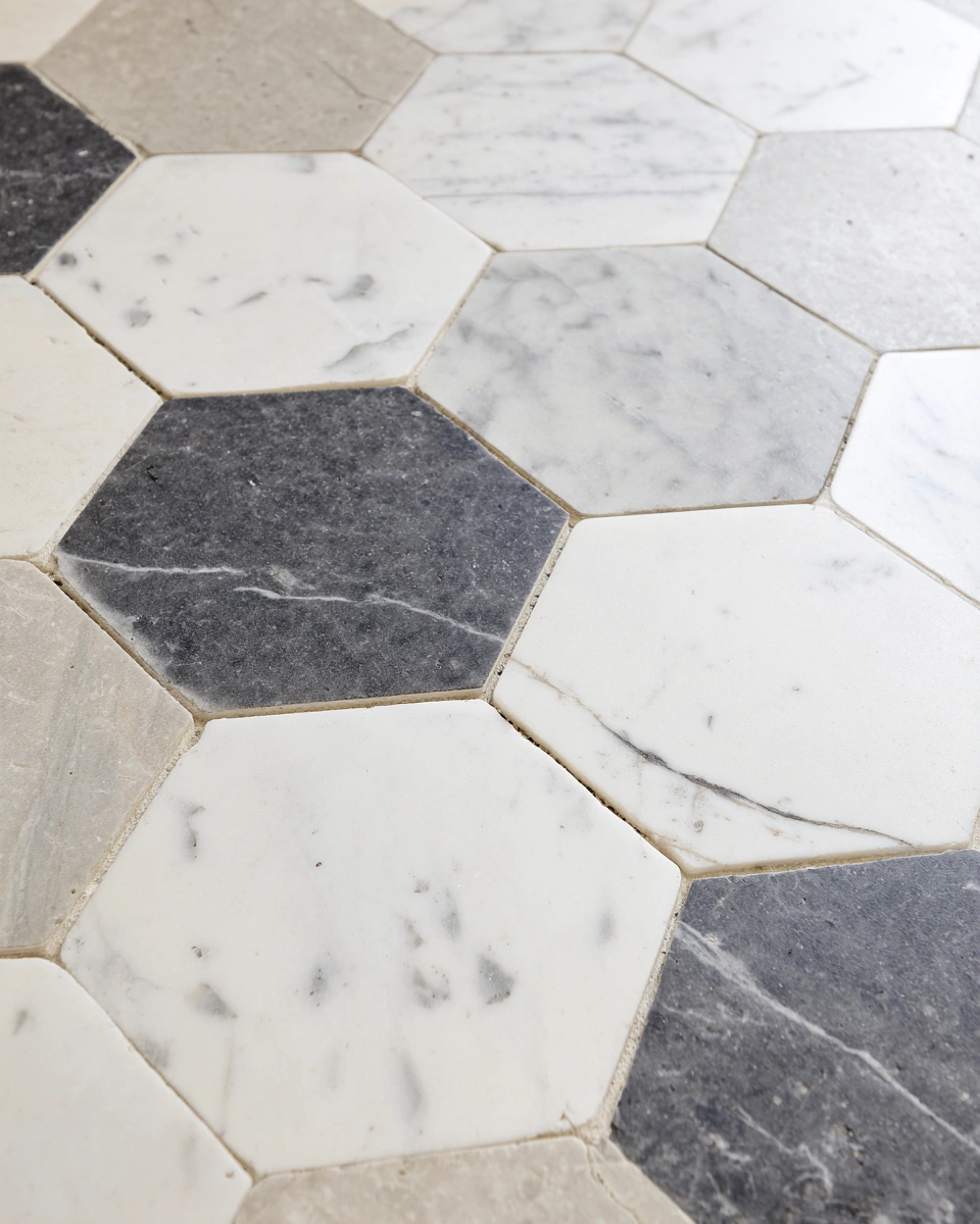 The chic hexagonal marble tiles in soft whites and deep grays create a striking visual that feels both modern and timeless. You can elevate your space while keeping maintenance easy by pairing these tiles with simple, elegant fixtures.
