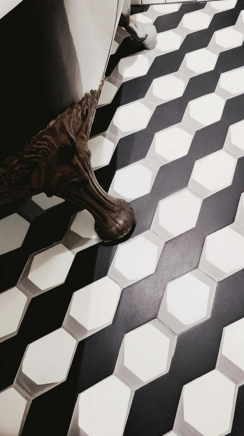 The black and white hexagonal tiles create a striking visual that effortlessly combines modern flair with a classic touch, making any bathroom feel incredibly chic. To balance the boldness and add warmth, pair these tiles with vintage-inspired fixtures and soft textiles.