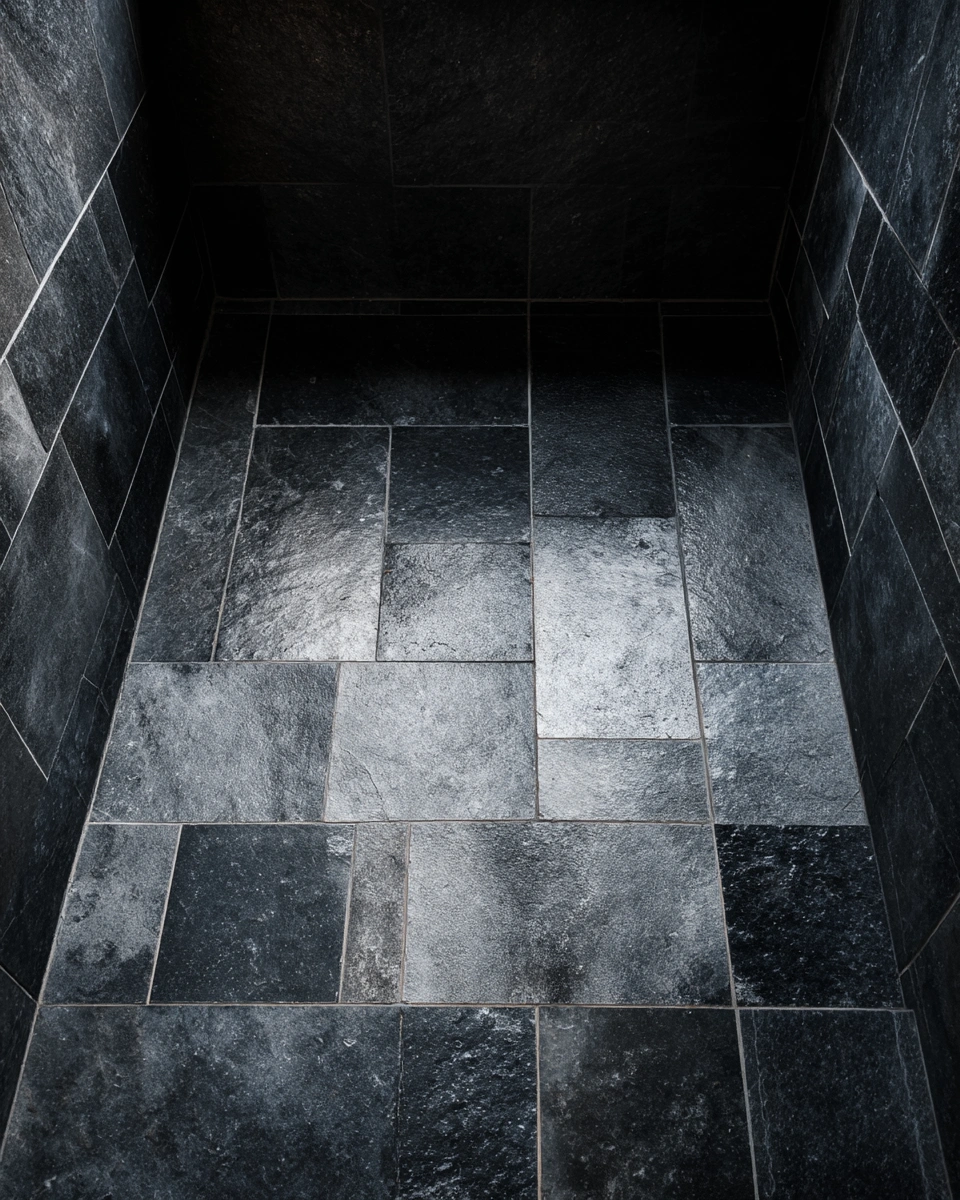 The dark gray slate tiles offer a sophisticated, modern foundation for any bathroom, and their natural texture adds a wonderful layer of depth and interest. To keep the space from feeling too cold, pair these tiles with the warmth of wood accents and soft, plush textiles for an inviting touch.