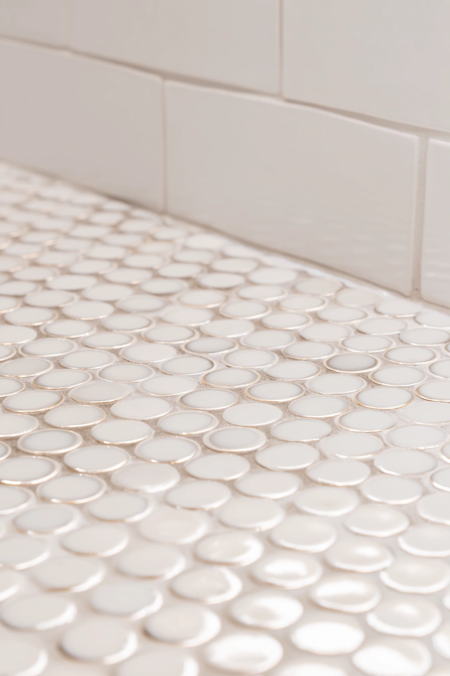 I love these! The glossy white pebble tiles create a fresh, airy vibe that instantly brightens up a space, and their smooth texture adds a touch of elegance. To achieve a similar look, pair these tiles with soft, neutral colors and minimalist accessories for a peaceful bathroom retreat.