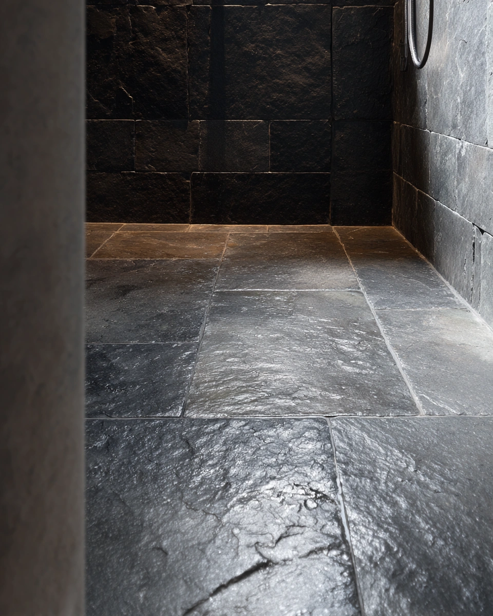 13) Sleek Dark Slate Bathroom Flooring