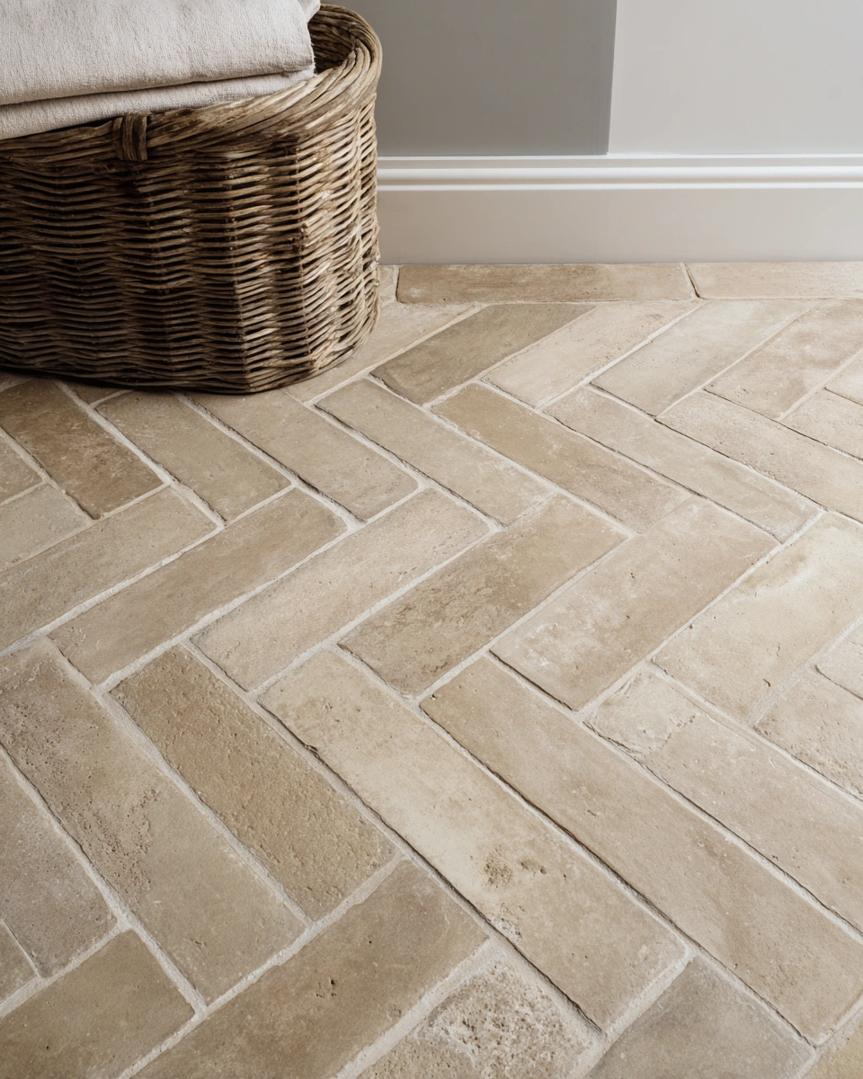 Warm beige tiles laid in a herringbone pattern offer a cozy yet elegant vibe, perfectly balancing texture and color to create a welcoming atmosphere. To get this look at home, consider using similar tones in your accessories and soft textiles to enhance the overall warmth.